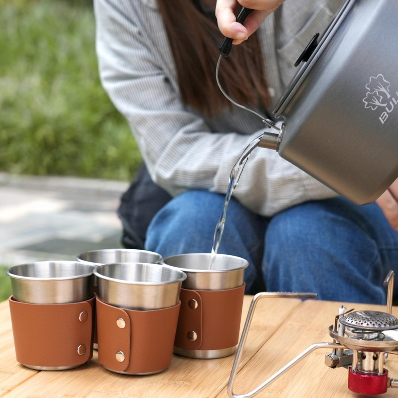 Bulin Kettle Camping 2.2 L Camping Kettle with 4 Stainless Steel Cups Camping Kettle for Home Camping Trekking Hiking Picnic Brown