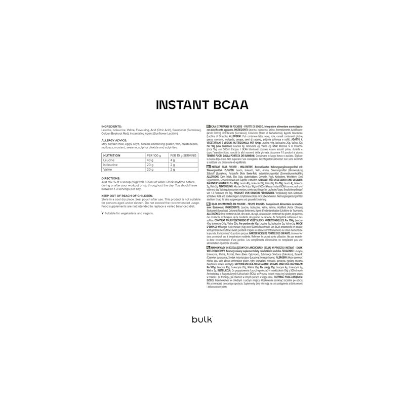 Product DescriptionGreat tasting, easy mixing branched chain amino acid powder, available in a range of delicious, refreshing flavours, providing a 2:1:1 ratio of leucine, isoleucine and valine BCAAs.Bulk formula uses the highest quality ingredients and is instantised for easy mixing, making it the perfect BCAA supplement if you need a steady supply of amino acids throughout the day.IngredientsLeucine, Isoleucine, Valine, Flavouring, Acid (Citric Acid), Sweetener (Sucralose), Colour (Beetroot Red - Mixed Berry, Passionfruit, Pink Lemonade, Strawberry & Watermelon; Beta Carotene - Lemon & Lime, Passionfruit, Pineapple & Coconut, Tropical; Caramel - Cherry Cola; Copper Chlorophyllin - Lemon & Lime; Grape Skin Extract - Mixed Berry; Spirulina Extract - Blue Raspberry), Emulsifier (Sunflower Lecithin).May contain milk, eggs, soya, cereals containing gluten, fish, crustaceans, molluscs, mustard, sesame, sulphur dioxide and sulphitesDirectionsMix 3/4 (three quarters) of a scoop (10 g) with 500 ml cold water. Instant BCAA is most commonly used before, during and after your workout or sipped throughout the day. Use 1 - 3 servings per day.Safety WarningFood supplements are not intended to replace a varied and balanced diet. Do not exceed the recommended usage. Keep out of reach of children.Manufacturer Contact InformationBulk, 1 Gunfleet, Colchester, CO4 9QX, UK / Bulk, Centrum Logistyczne, ??kowa, 23, 55-095, Mirkw, Poland.
