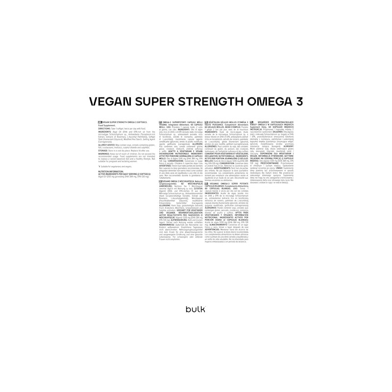 Product DescriptionWhen it comes to getting your necessary omega 3s, the mind tends to drift towards fish oils, specifically the essential fatty acids eicosapentaenoic acid (EPA) and docosahexaenoic Acid (DHA). For decades, fish oil has been the primary source of these healthy fatty acids. However, in recent years, the algae industry has caught up. It makes sense to get omega 3s from algae, being the primary source of nutrients in the marine food chain. By choosing an algae supplement, you'll be cutting out the middleman (or middle fish in this case). Vegan Super Strength Omega 3 Softgels are made with a blend of algae oils to provide a high dose of essential fatty acids. Each daily serving of two softgels provides 384mg DHA and 128mg EPA; enough to contribute towards a healthy heart*, a healthy brain** and healthy eyes***. This is a plant-based supplement that's worth adding to your regime, no matter your choice of diet. Vegan Super Strength Omega 3 Softgels are incredibly convenient to use. Just take 2 capsules daily, preferably with food. They can also be combined with other health & wellbeing supplements to suit your individual needs. Vegan Super Strength Omega 3 Softgels are supplied in fully recyclable aluminium packaging. They are also encased in a completely vegan softgel shell, made from a blend of corn starch and seaweed. This is a plant-based alternative to the traditional bovine gelatine shell that most omega 3 supplements use, giving you a high-strength, completely animal-free supplement. *EPA and DHA contribute to the normal function of the heart. The beneficial effect is obtained with a daily intake of 250 mg of EPA and DHA. **DHA contributes to maintenance of normal brain function. The beneficial effect is obtained with a daily intake of 250 mg of DHA. ***DHA contributes to the maintenance of normal vision. The beneficial effect is obtained with a daily intake of 250 mg of DHA. Purpose Our Vegan Super Strength Omega 3 Softgels are suitable for anyone looking to add a convenient supplement to their daily healthcare routine. They contain high doses of essential fatty acids and can be used by absolutely anyone.IngredientsAlgal Oil (DHA and EPA-rich oil from the microalgae Schizochytrium sp., Antioxidants (Tocopherol-rich Extract, Extracts of Rosemary, L-Ascorbyl Palmitate)), Softgel Shell (Humectant (Glycerol), Modified Pea Starch, Gelling Agent (Carrageenan)). May contain soya, cereals containing gluten, fish, crustaceans, molluscs, sulphur dioxide and sulphites.Safety WarningFood supplements are not intended to replace a varied and balanced diet. Do not exceed the recommended usage. Keep out of reach of children.Manufacturer Contact InformationBulk, 1 Gunfleet, Colchester, CO4 9QX, UK / Bulk, Centrum Logistyczne, ??kowa, 23, 55-095, Mirkw, Poland.