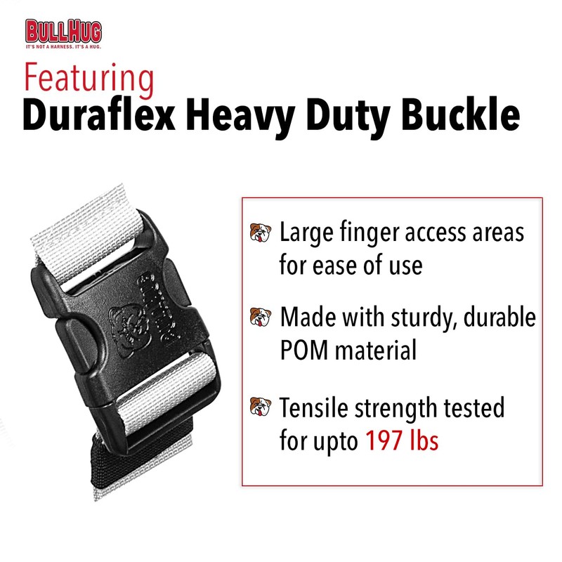 Goes on Easy! Unlike some harnesses, BullHug is incredibly easy to put on your pup. Just slip it over your dog's head, and clasp the heavy-duty fast-release plastic side release buckle.
