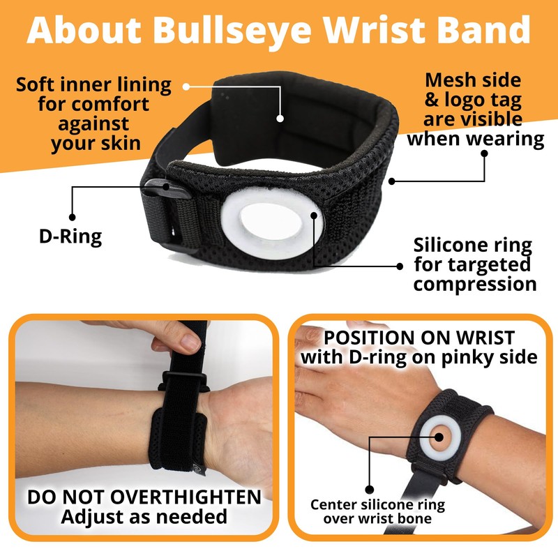 - SIMPLE TO USE & EASY TO ADJUST The Bullseye Wrist Brace is simple to apply and adjust for maximum comfort making it the ideal wrist brace for women & wrist brace for men. To use, position the brace with the D-ring on the pinky side, insert the strap through the D-ring, and center the silicone ring over the wrist bone. Turn your palm up to fasten the strap snugly, providing a comfortable fit. Be sure not to overtighten, and adjust as needed throughout the day for continuous support and comfort.