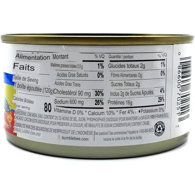 • Bumble Bee White Crabmeat is meat from the body of the crab. This meat is flaky in appearance. Great for dips and hors d'oeuvres.