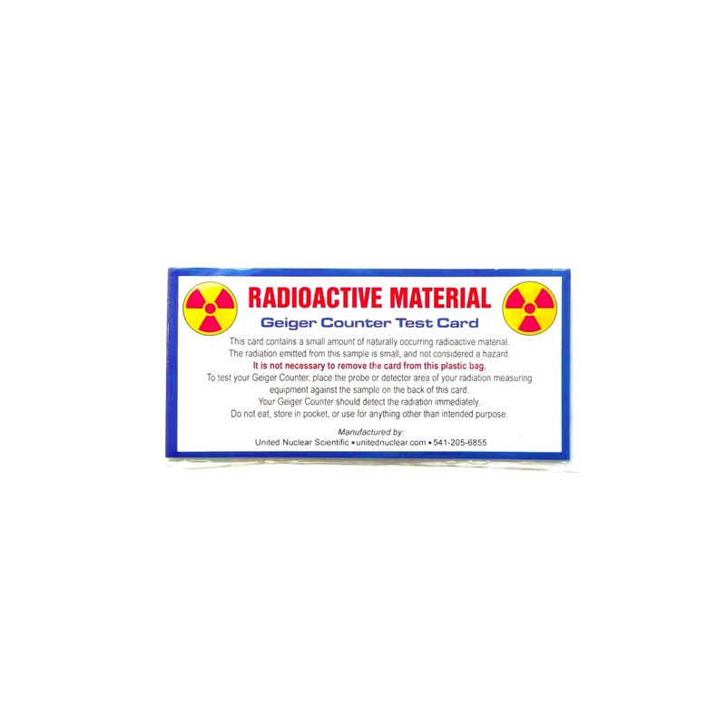 - 【United Nuclear Geiger Counter Test Card】: Safe test sample for radiation detection equipment. Consists of a waterproof and durable card with a small radioactive source attached, eliminating the need to remove it from the plastic enclosure for use. Instantly verifies the operation of Geiger counters by placing the instrument or its probe on the rear of the card. Provides low-level Gamma & Beta radiation detectable by common radiation detectors. Works with all standard Geiger counters.