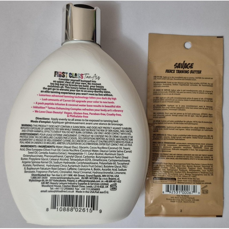 - Bundle of 2 items: Luxury advanced tanning lotion “First Class” Bottle (white colour lotion) 400 ml - 1 and Savage Fiji Blend Tanning Lotion Packet (white colour lotion) 15 ml - 1;