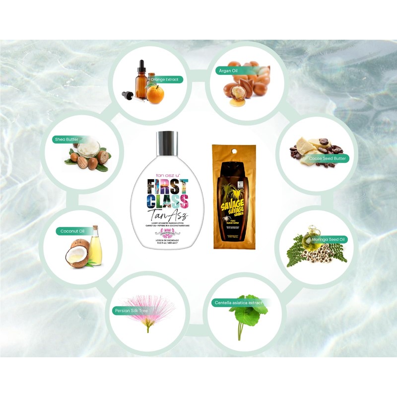 Bundle of 2 Items: First Class Luxury Advanced Tanning Lotion Bottle 400 ml and Savage Fiji Blend Tanning Lotion Packet 15 ml.