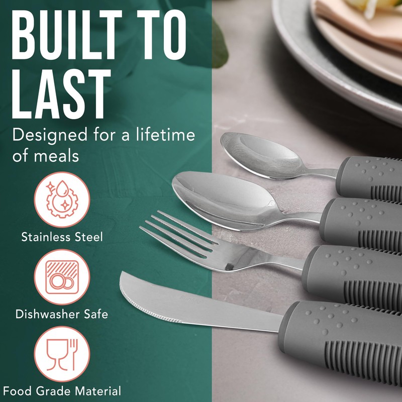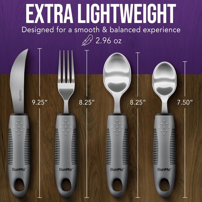 - Convenient four-piece set: Tablespoon, teaspoon, rocker knife and fork. Perfect arthritis aids