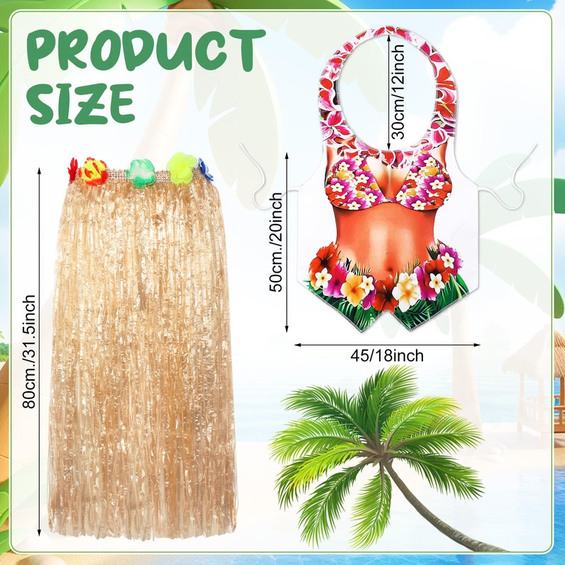 - Package Includes: you will receive a set of funny Hawaiian costumes, including a funny bikini apron and a grass skirt, which is suitable for luau and beach parties; Funny beach apron set can also be applied as cosplay costume on summer party