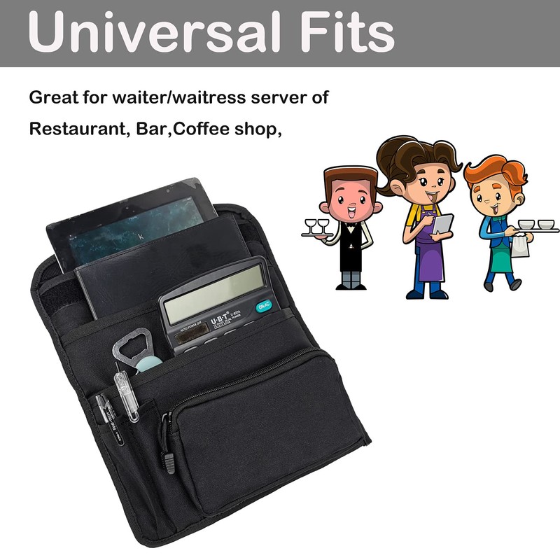 - The servers apron pouch is made of premium water resistance nylon oxford, features 3 pockets for ipad, tablet, guide/check book, waiter wallet carrying, great for coffee shop, bar & restaurant waiter/bartender servers