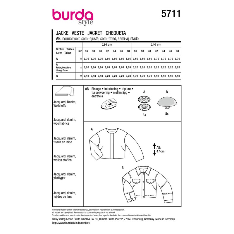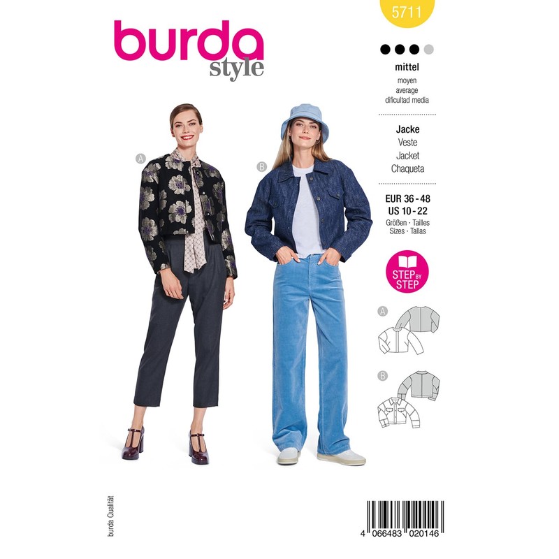 Burda Style #5711 Sewing Pattern Women's Short Jackets Size 8-20