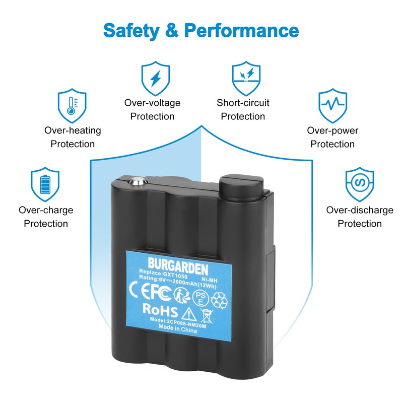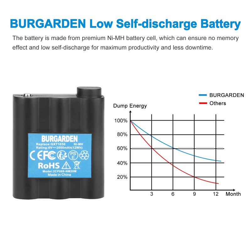 • 【Battery Specifications】 Battery Voltage: 6V; Capacity: 2000mAh; Battery Type: Ni-MH; Quantity: 2 Pack. The 2000mAh high-capacity GXT1000 replacement battery for Midland makes it easy to longer running time and more power for your walkie-talkie.