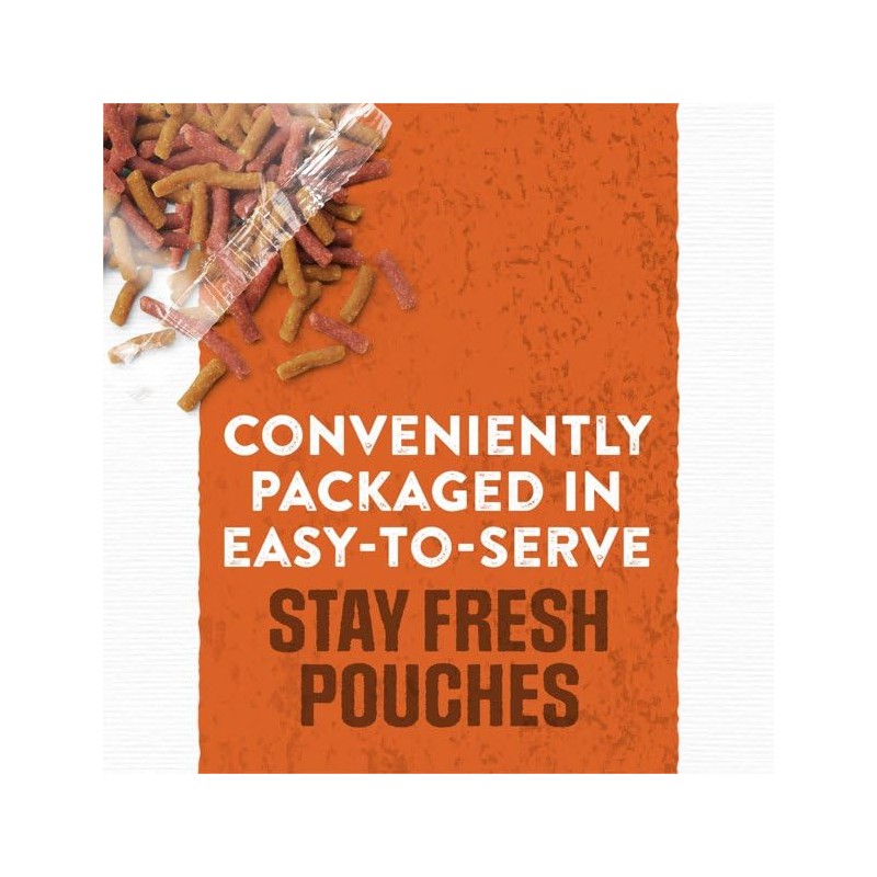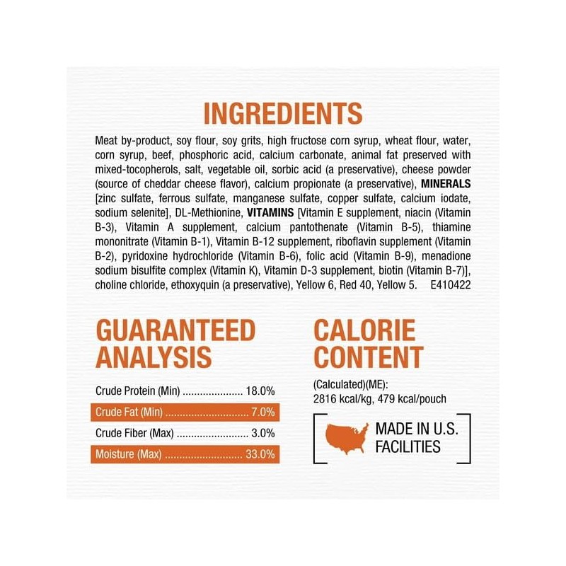 Plus, you'll get the satisfaction that you're providing your dog with 100 percent complete and balanced adult dog food nutrition. You can serve this delicious formula to give your loyal friend a meaty dog snack between meals or to enhance their daily meal with dog food toppers. This dog food beef and cheddar recipe comes in individual stay-fresh pouches to ensure freshness so that each serving will be flavorful and tender. Each pouch is designed to help you provide your dog with quick, no-mess snacks or toppings for dog food.