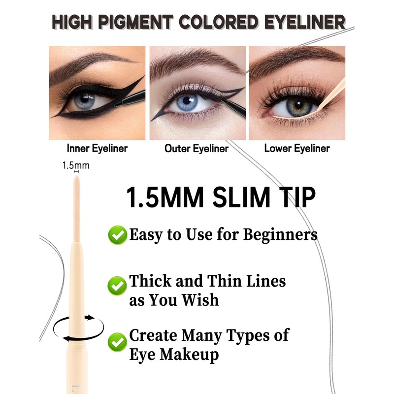 - 1.5MM Slim Tip - The ultra-smooth, high-precision tip makes it easier for you to draw eyeliner with a silky-smooth stroke and a soft, smudge-free finish. Even a novice can easily control it, both thick eyeliner and thin eyeliner can easily get started without worrying about making mistakes.