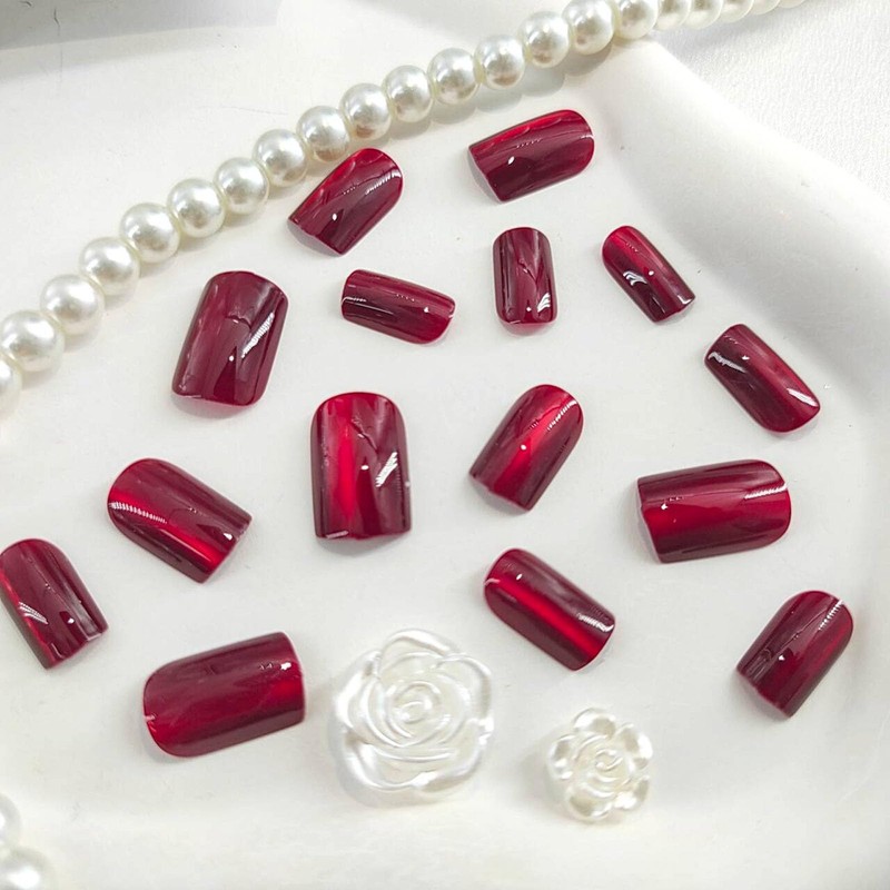 Burgundy Press on Nails Square Medium Fake Nails with Cat Eye Designs Red Nai...