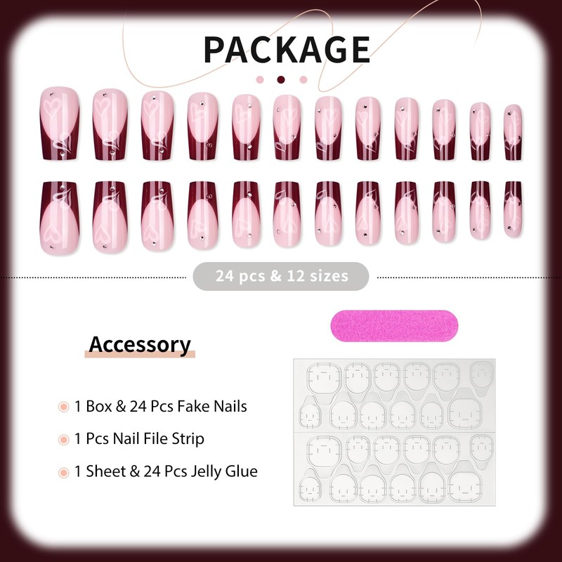 Square Tip Press On Nails, Burgundy With Silver And Pink Heart Design, Salon Quality Professional DIY Nails, Everyday Glossy Stick On Nails, Glue On Nails For Women and Girl Gift, Ready to Wear 24 Pcs Nail Kit, Reusable Fake Nails in 12 Sizes, Medium Length Faux Nails.