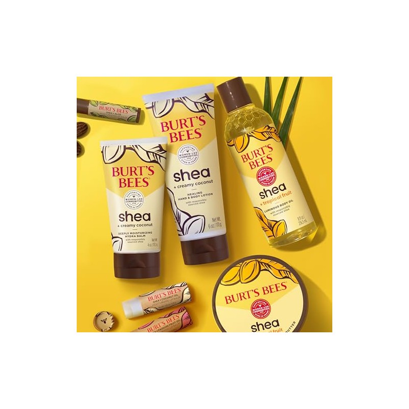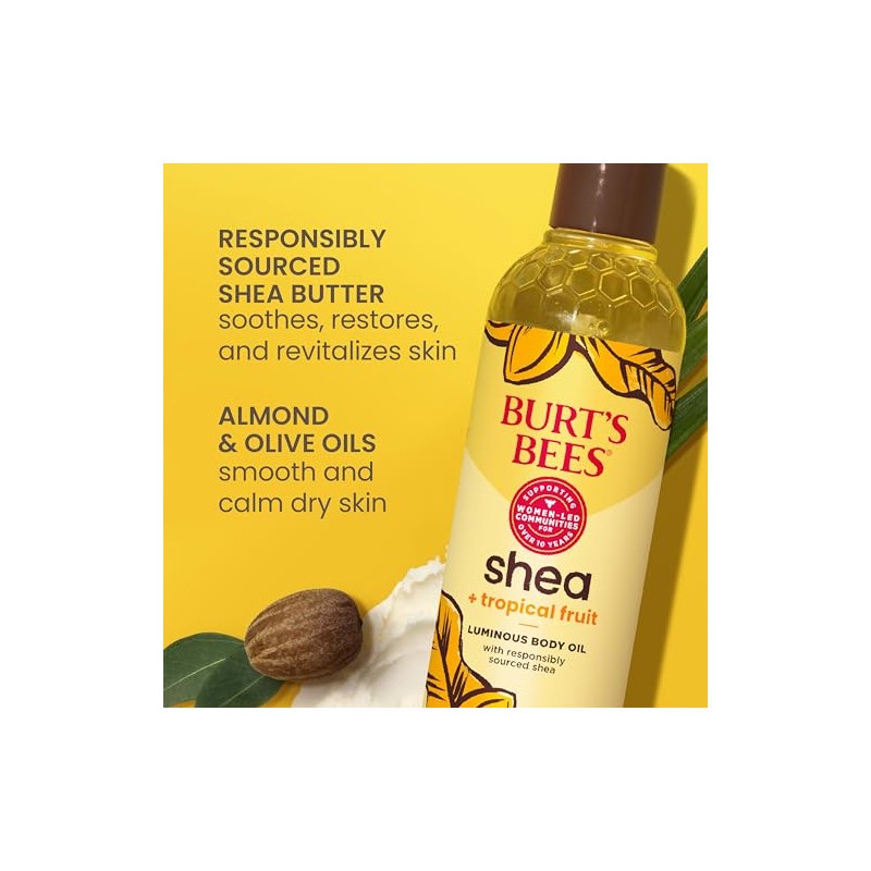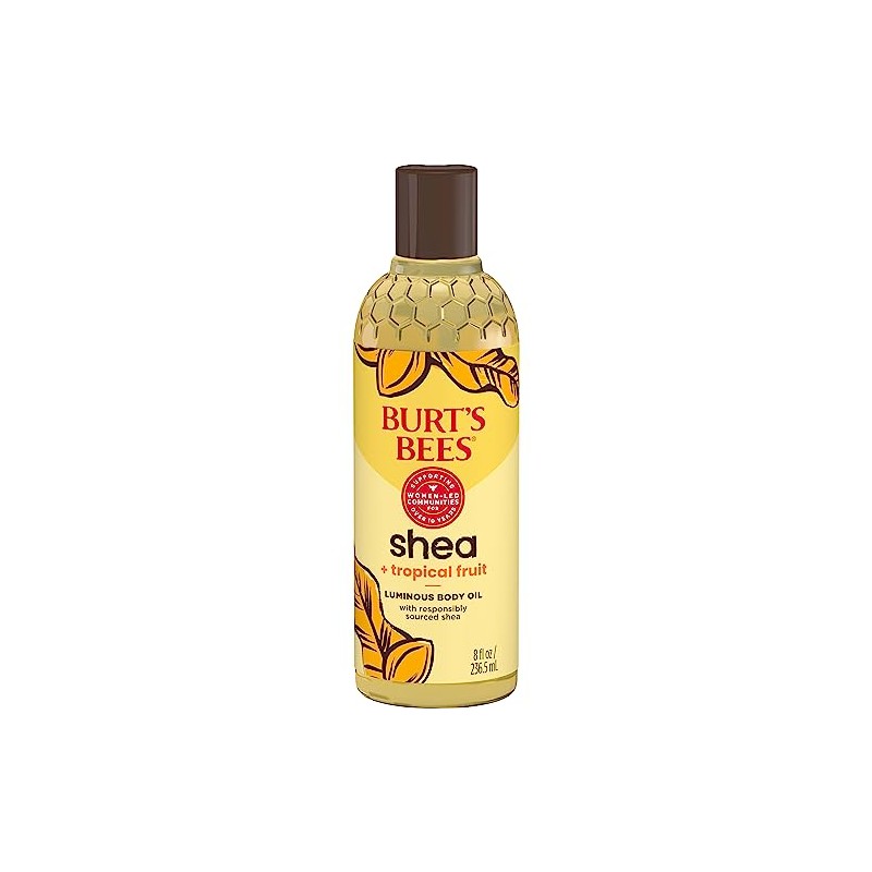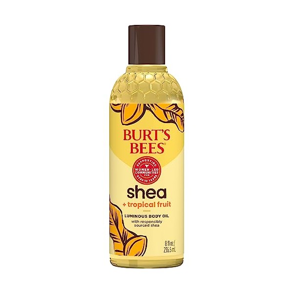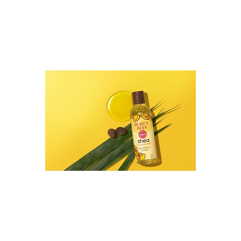- NATURAL BODY OIL: One 8 oz. bottle of Burt's Bees Shea + Tropical Fruit Luminous Body Oil that's a lightweight, multipurpose body and hair moisturizer that lets you enhance your glow