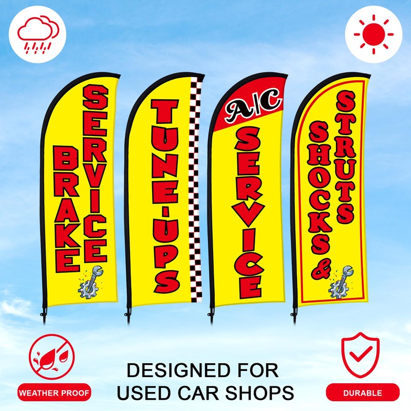 - Comprehensive Package: each auto repair feather flag kit comes with 4 auto repair shop feather flags, 4 set flagpoles and 4 ground spikes, giving everything you need to set up an effective advertising display right away