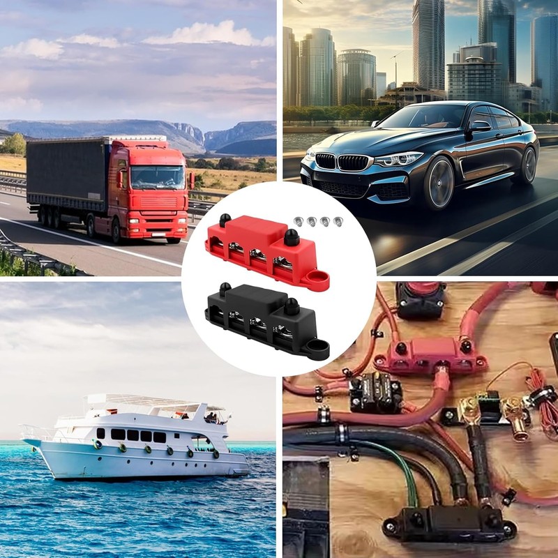 2 junction boxes: the black car junction box is connected to the negative pole and the red to the positive pole, which is convenient for wiring and circuit management. Safe, reliable and durable. The power distribution block holds wide cables securely and keeps cables neat and organized.