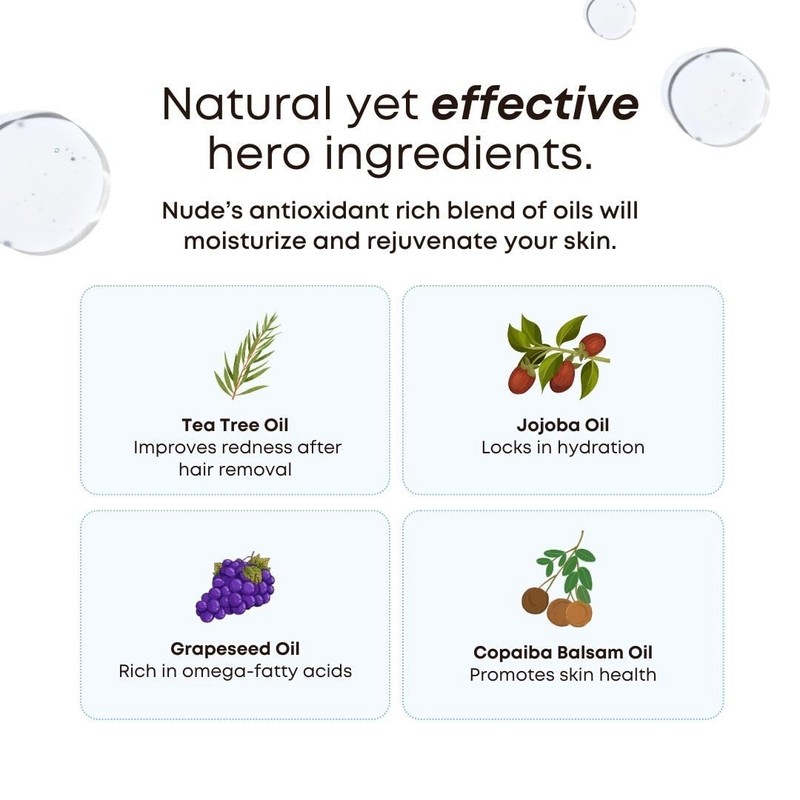 - How Nude Oil Works: 6 natural ingredients work together to nourish and hydrate the skin while reducing the occurence of ingrown hairs at the same time. The combination of jojoba, grapeseed and tea tree relieves dryness and soothe skin, it is also effective in reducing the occurence of rough, bumpy skin.