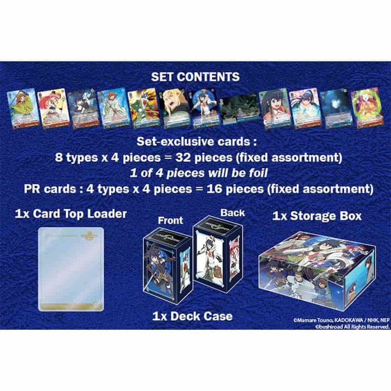 Each box contains: 32x SET-EXCLUSIVE CARDS 8 types x 4 pieces = 32 pieces 1 of 4 pieces will be foiled! 16x PR CARDS 4 types x 4 pieces = 16 pieces 1x CARD TOP LOADER 1x DECK CASE Size: 98 x 75 x 65mm Holds up to 75x Double-Sleeved Cards or 65x Triple-Sleeved Cards 1x STORAGE BOX Size: 78 x 168 x 106mm Holds up to 2x Deck Cases 48 cards + 1 deck case + 1 card top loader + 1 deck box + 1 storage box per set The cards in this Booster Pack may be used together with cards that have card numbers beginning with