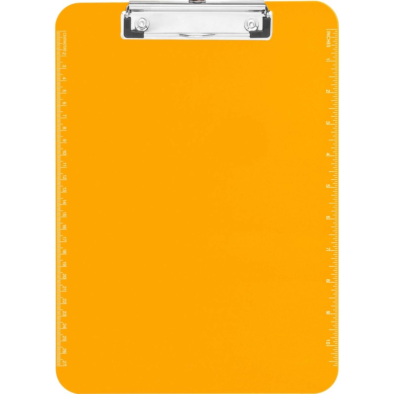 Clipboard provides a stylish, functional way to write without the use of a desk. Flat clip makes this durable, transparent plastic clipboard space-efficient and easy to use. Imprinted rulers on both sides of the clipboard have measurements in Imperial and metric. Clipboard includes a pullout tab for hanging.