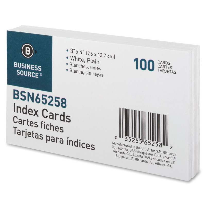 Business Source Unruled White 3" x 5" Index Cards - Pack of 100 (65258)