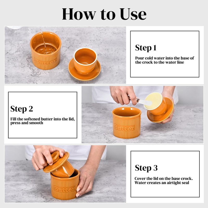 - Airtight Water Seal: Simply fill the bell with butter, gently press it down with a butter knife or spoon, and add 1/3 cup of cold water into the crock. The water creates an airtight seal that protects your butter from dust and air, ensuring the butter stays fresh at room temperature.