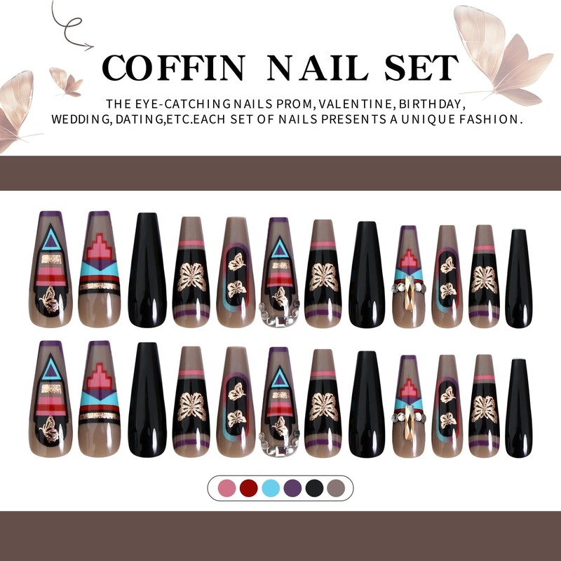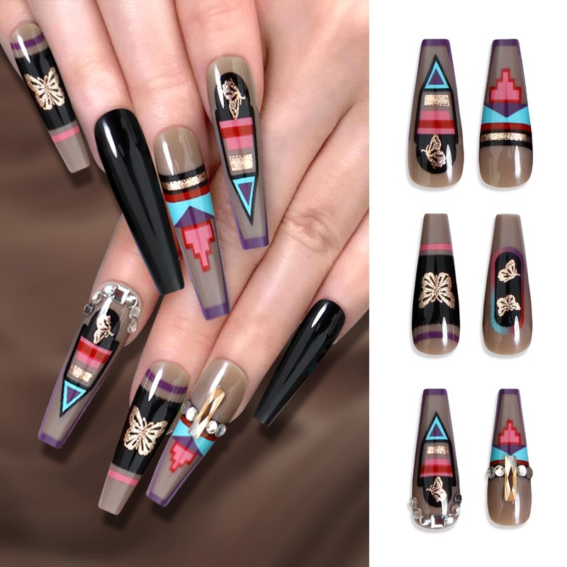 Butterfly Coffin Nails Ethnic Brown French Tip Geometry Glitter Charm Designs Artificial Nails 3D Diamond Rhinestones Women Manicure Kit