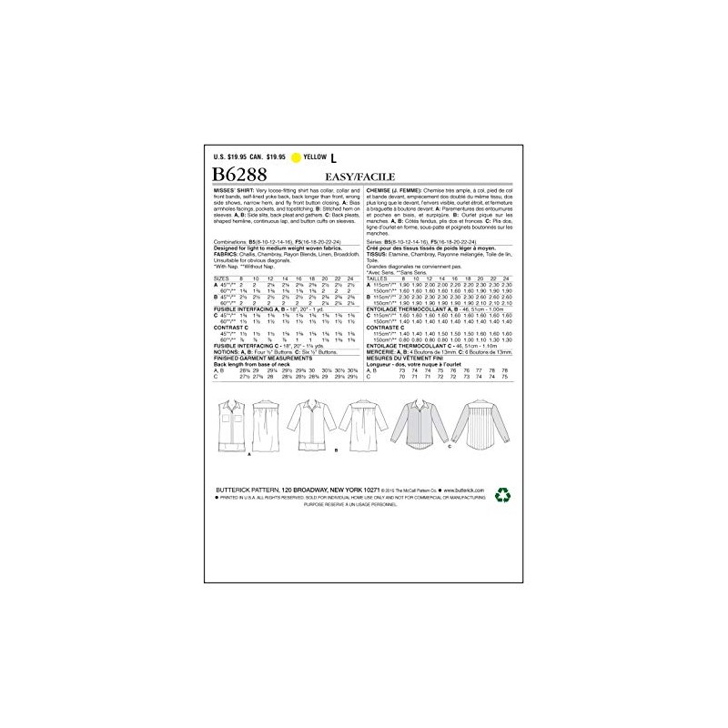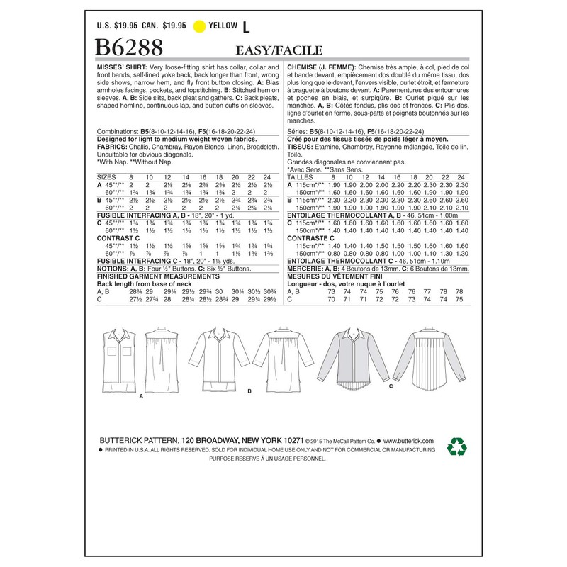 Butterick Patterns B6288 Misses' Shirt, B5 (8-10-12-14-16)