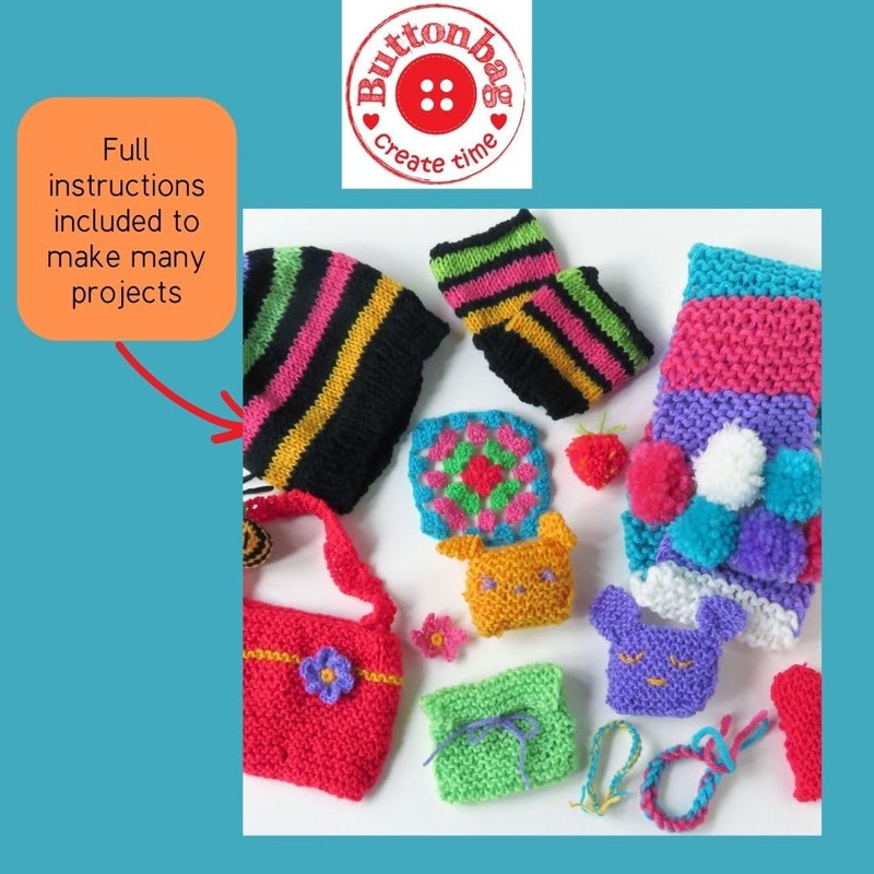 New from Buttonbag! This BUMPER suitcase has everything you need to learn how to knit and crochet and complete loads of fantastic projects! This kit combines our Knitting and Crochet kits in one even bigger suitcase. Full instructions teach all the basic techniques and there are very easy patterns to follow, perfect for beginners.The kit contains 10 balls of yarn, 2 pairs of knitting needles, a crochet hook, a pompom maker, scissors and full colour instructions to make loads of things including a hat, a purse and bag, cute pets, granny squares, flowers, a bee and lots more.