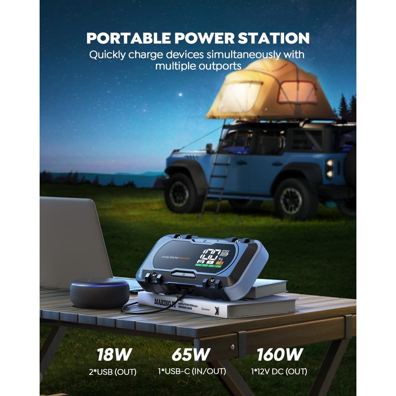- 【65W BI-DIRECTIONAL LIGHTNING-FAST CHARGING】With our 65W USB-C IN/OUT Bi-Directional Speed Charge Tech., the car battery charger jump starter only takes 1 hour to charge from 0% to 80%, get running in as little as 5 mins. And also power your phone up to 5X faster, supporting laptops. The battery jump box stands by for 24 months, ensuring you're always ready to go with peace of mind.