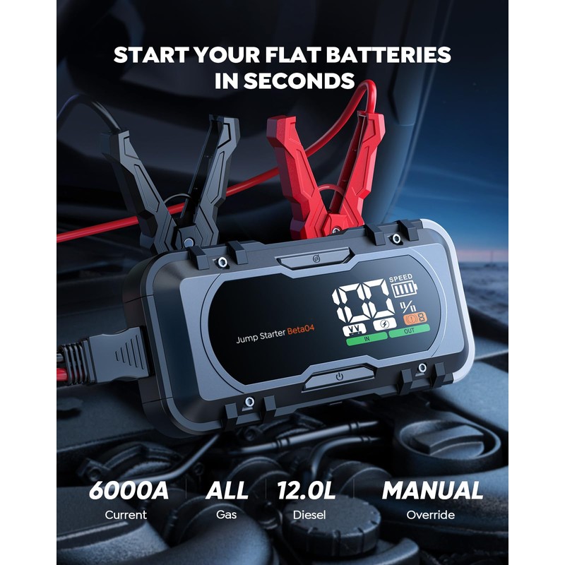 - 【START COMPLETELY DEAD BATTERIES 】The car battery jump starter has unmatched 6000A current, 5 times that of general jump starter. The portable car jump starter with dual start assurance can instantly start your stranded vehicles (up to all gas/12L diesel) including completely drained batteries even at -20℃, and support 1000+ recharge cycles. Start car confidently every time, which is far easier than get help from another car or roadside service!