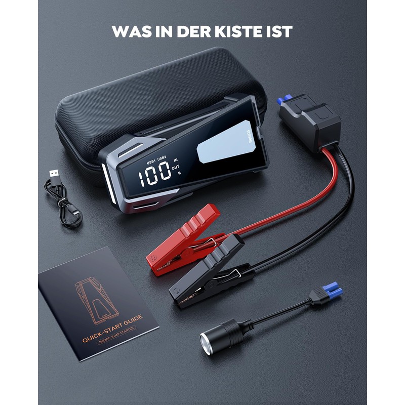 • Was Sie erhaltenJump Starter, Smart Clamps, USB C Kabel, DC-Zigarettenanznder-Adapter, Tragekoffer, Bedienungsanleitung, 24 Monate 100% KOSTENLOSE Garantie & 24/7 freundlichen Kundenservice. Ein nagelneues ideales Car jump Starter fr Autofahrer! Bestellen Sie es also mit Vertrauen fr Verkehrssicherheit und Ihre Sicherheit.