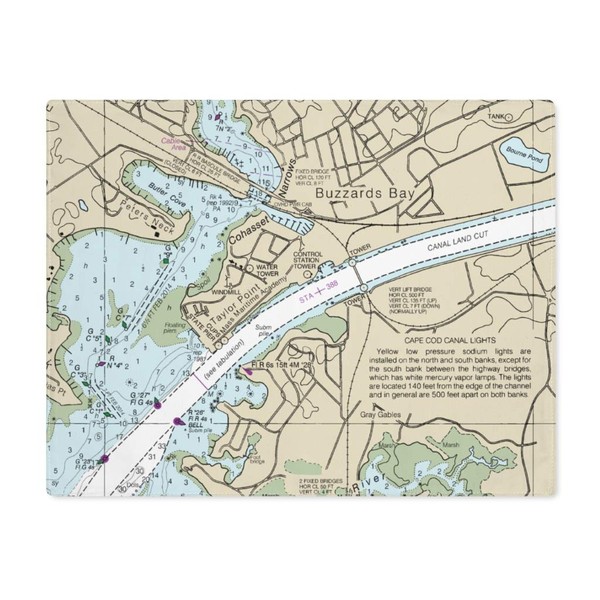 Buzzards Bay Cape Cod Canal Entrance Nautical Chart Cotton Placemat Set - SET of 4, 18" x 14"