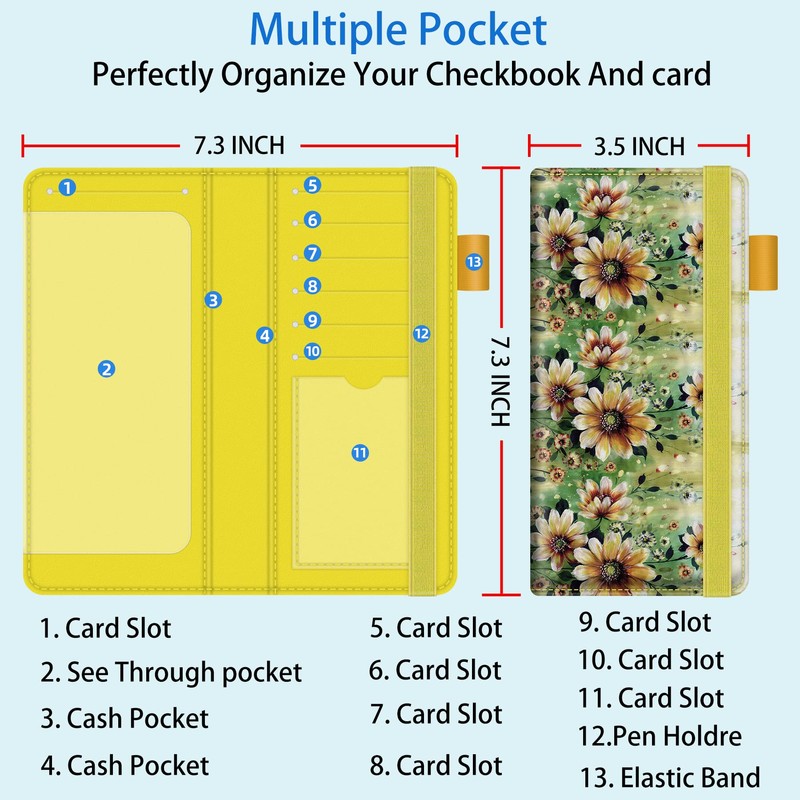 - COOL CONSTRUCTION: Our check book organizer with 1 ID crad slot, 7 credit card slots, 2 large pockets for checks, registers, bills, receipts and so on. 1 transaparent film part for you to put your ready-to-go checks and files for quick access. A pen holder design for the check book cover which can meet your daily use. With a elastic strap to keep the check book cover close securely without worring about the items to fall off.