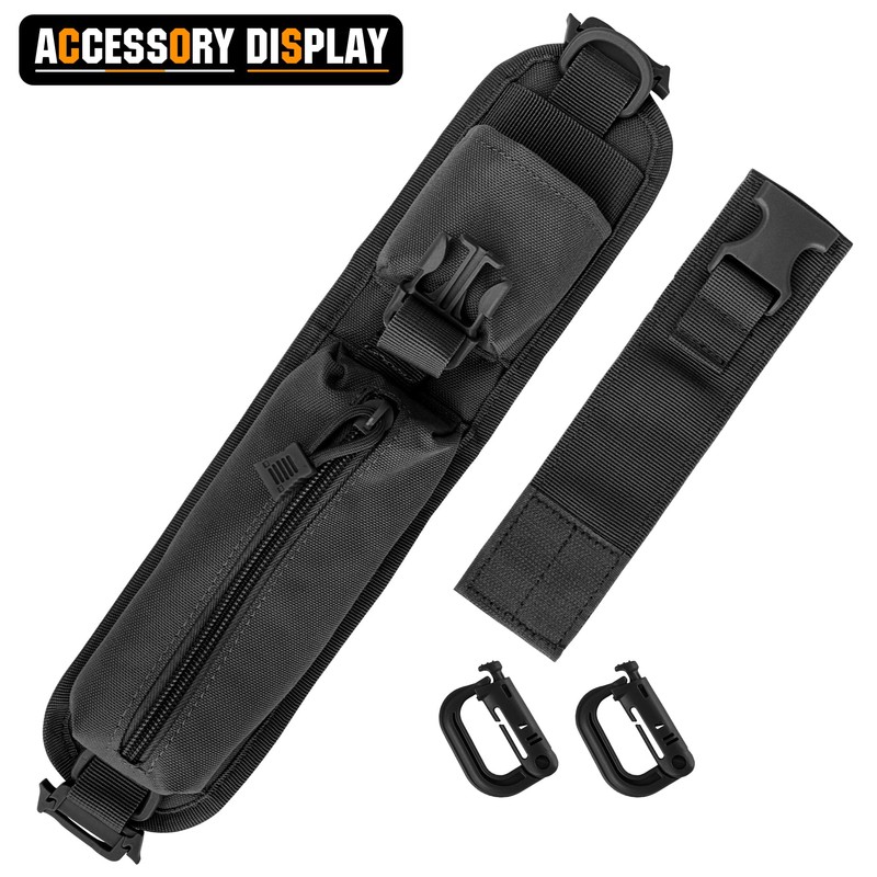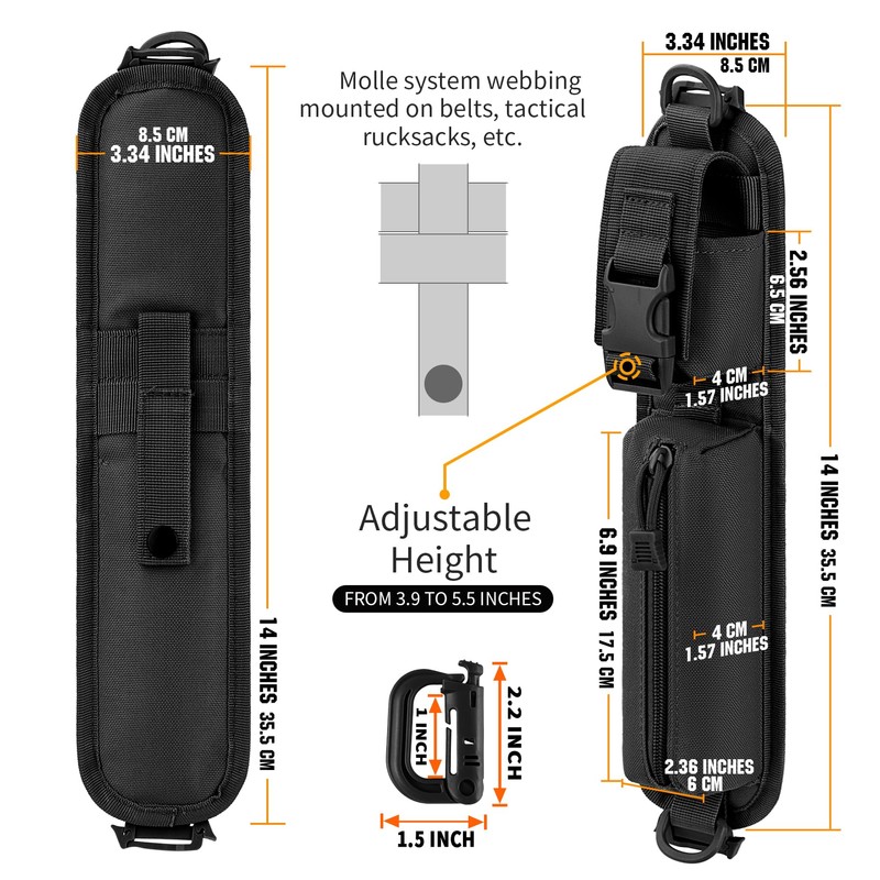 - Size: 16.5cm x 6cm zipper pouch for holding sunglasses, flashlight or other tiny gadgets; buckle pouch for holding note book, walkie-talkie, power bank and etc.