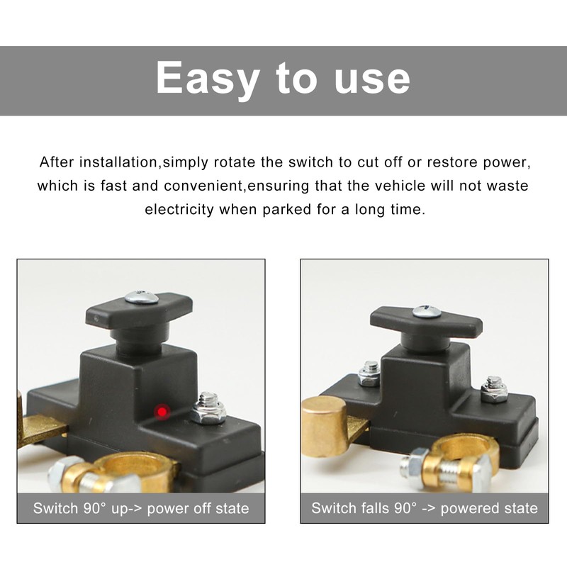 - Easy Installation: The installation process is straightforward. First disconnect the negative terminal of the vehicle battery. Then connect both ends of the switch to the positive and negative poles of the battery respectively, and secure them with the included screws