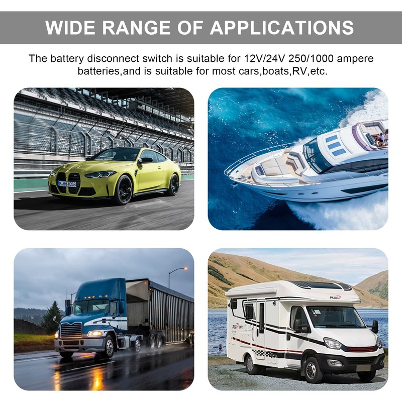 - Broad Compatibility: This switch supports 12V and 24V systems with a peak current of 1000A and a rated current of 100A. It fits a wide range of vehicles, including cars, trucks, RVs, boats and ATVs, offering versatile use across automotive and marine environments