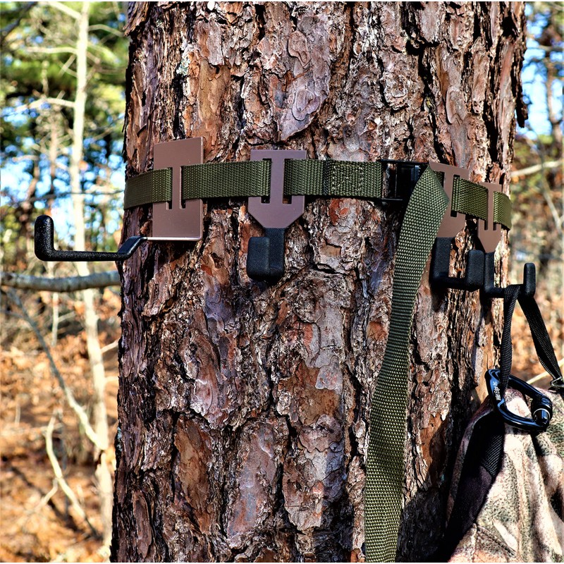 - N0 Plastic Parts - All Quality Metal Construction. No More Worries, about hanging your Bow, heavy Pack or valuable Camera and Binoculars on a weak screw in hook or plastic hook and plastic buckle assembly. The Perfect Hanger for Saddle Hunting, Mobile Hunting, and all Treestand Hunting - On your Tree faster than 1 Screw-In Hook -Make Your Set Up Simple! The End of Screw-In Frustration!