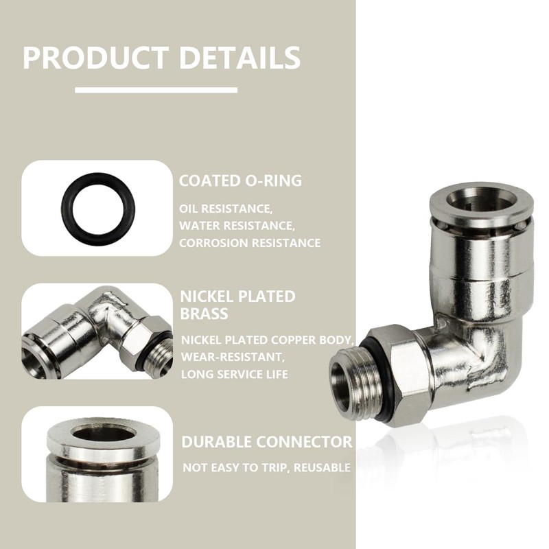 - 【Package】: 5 pieces nickel-plated brass elbow push in connect pneumatic screw connection.