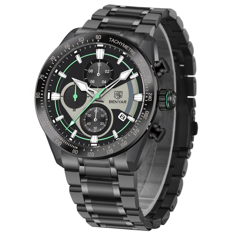 - 【3ATM waterproof and Luminous】BENYAR's waterproof chronograph watches for men is waterproof 30M/3ATM, can withstand sweat, accidental rain or water splash (Showering, swimming, immersion in water is not recommended). After absorbing enough light energy to have a certain glow-in-the-dark effect in dark environments.