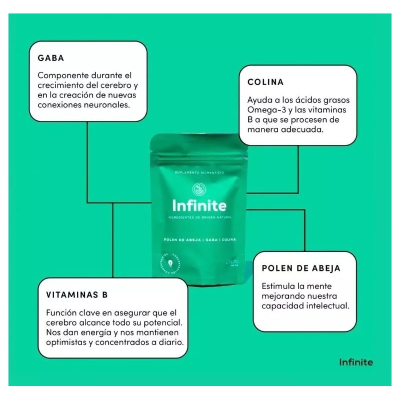 Infinite es un producto que potencia el enfoque, la concentración, mejora la memoria y la agilidad mental. Estimula la creación de ideas más trascendentes y creativas, y aumenta el nivel cognitivo.