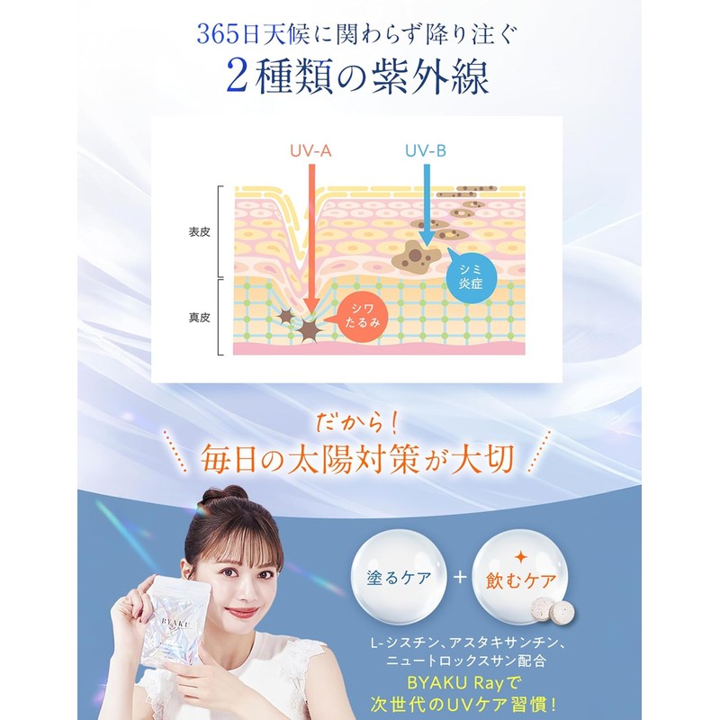 Byakurei Drinkable Sun Protection Supplement "Just chew 2 tablets a day" Triple UV Protection Formula L-Cystine x Astaxanthin x Vitamin C (60 tablets for 30 days)