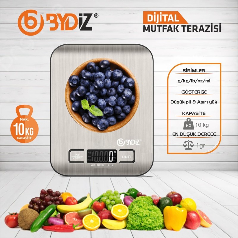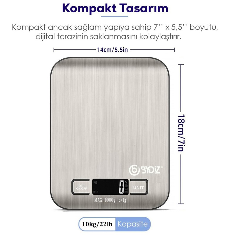 Bydiz BY-005 Dijital Mutfak Terazisi - Paslanmaz Çelik Yüzeyli Hassas Mutfak Tartısı - Dara İşlevi, LED Ekran, 5 Birim Dönüştürme ve Otomatik Kapanma Özellikli - 10 kg Tartı Kapasitesi