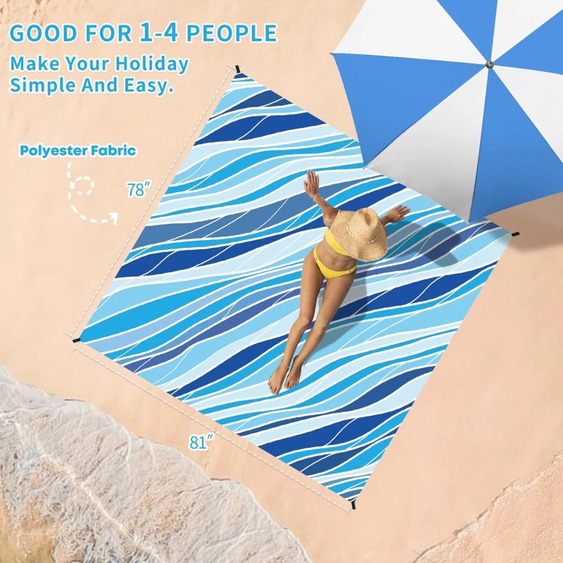 - 🌴Beach Blanket Waterproof Sandproof:78''×81''size beach blanket,suit for 1-4 adults.Made by parachute fabric,odorless,tear-resistant 210T polyester.Light weight and small after folding.Only 12 oz,small and mighty,which is easy to carry!