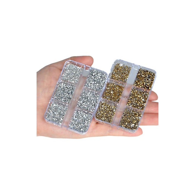 - 6 Sizes rhinestones in two boxes with 12 grids. They are SS3: 1.3mm, SS4: 1.5mm, SS5:1.7mm, SS6: 1.9mm,SS8:2.3mm and SS10: 2.7mm. Including a large number of large-size rhinestones, enough to succeed a complete clothing and shoes crafts project.