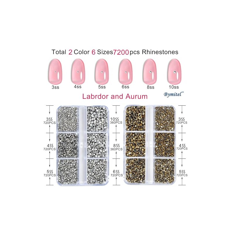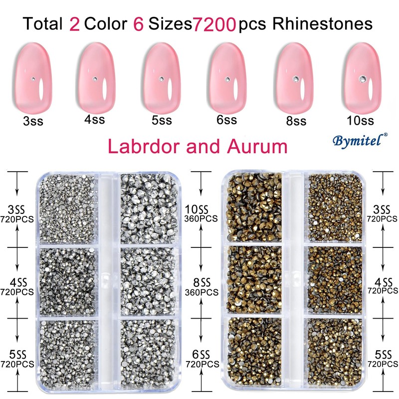 - Package includes: 3600pcs Aurum and 3600pcs Labrdor flatback glass glittering rhinestones bulk in 6 sizes, with good quality tweezers and picker wax pencil.