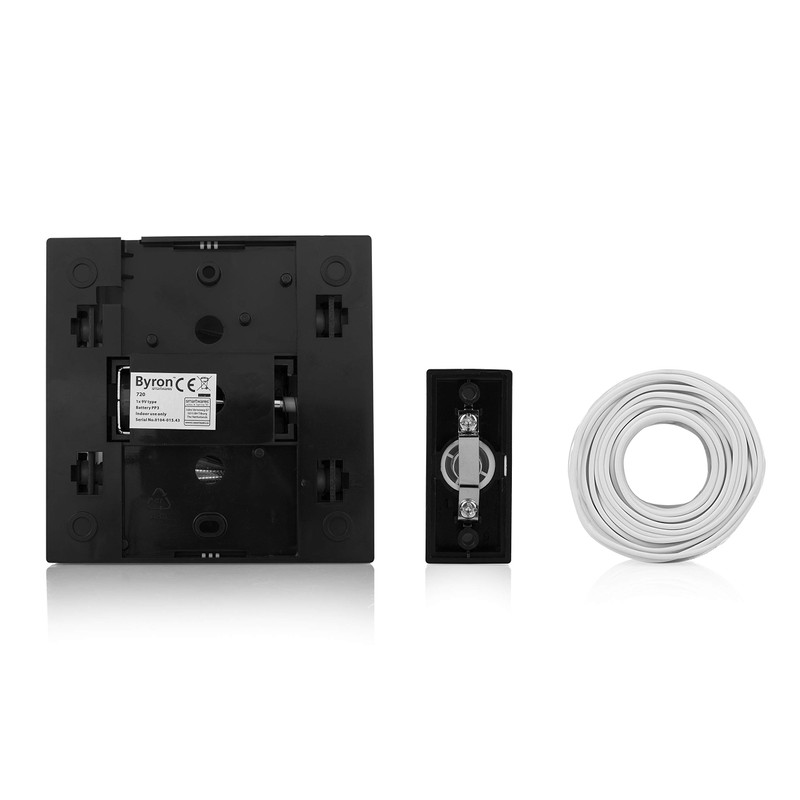 The Byron BQ20/720 Wall-Mounted Chime Kit is a hard wired wall-mounted kit with an Electro-mechanical (ding dong). Includes bell push, door chime, cable and clips. Requires 1 x 9V Battery (NOT included). BQ20/720 Wall-Mounted Chime Kit