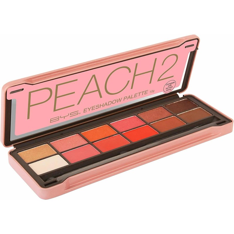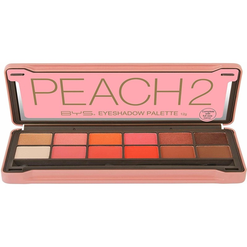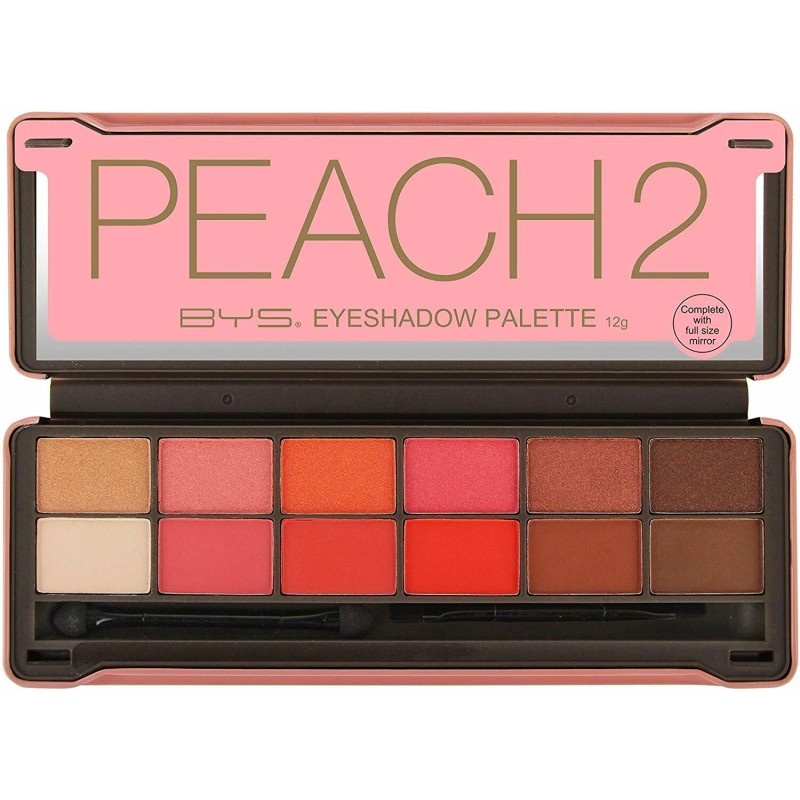 BYS Peach 2 Palette features twelve multi-dimensional shades to help create endless on-trend looks. The top row features six intense metallic shadows and the bottom includes six soft blendable matte shadows. Formulated with skin-loving ingredient Mica to help leave a silky-smooth finish on lids. The longwearing formula is true to colour and does not crease or fade. Includes bonus sponge, brush applicator and full-length mirror for on-the-go application.