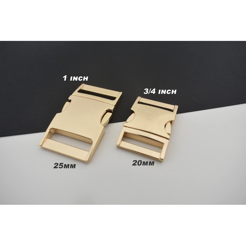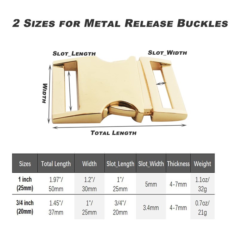 - 1 inch Buckle. 6 pcs included. Made of zinc alloy, electroplated surface,glossy, lightweight(1.1oz/pcs), but sturdy. Great for less 1"(25mm) wide nylon webbing or leather straps. Buckle's size when locked: 1.97"(50mm)L x 1.2"(30mm)(L*W), Max Thickness 0.28"(7mm).(Note photo size detail)