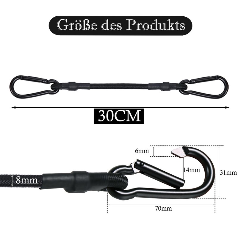 - Elastic band, black, assorted size: 4 pack bungee cord hooks 30 cm. It has an advantage in length and width over ordinary bungee cords. It has a stronger load capacity and can meet your higher requirements. These high-performance bungee cords are highly elastic and supportive and are compatible with bags of all sizes and weights. Compatible with all bikes, cars, carts, pannier racks, camping, gardening, washing lines
